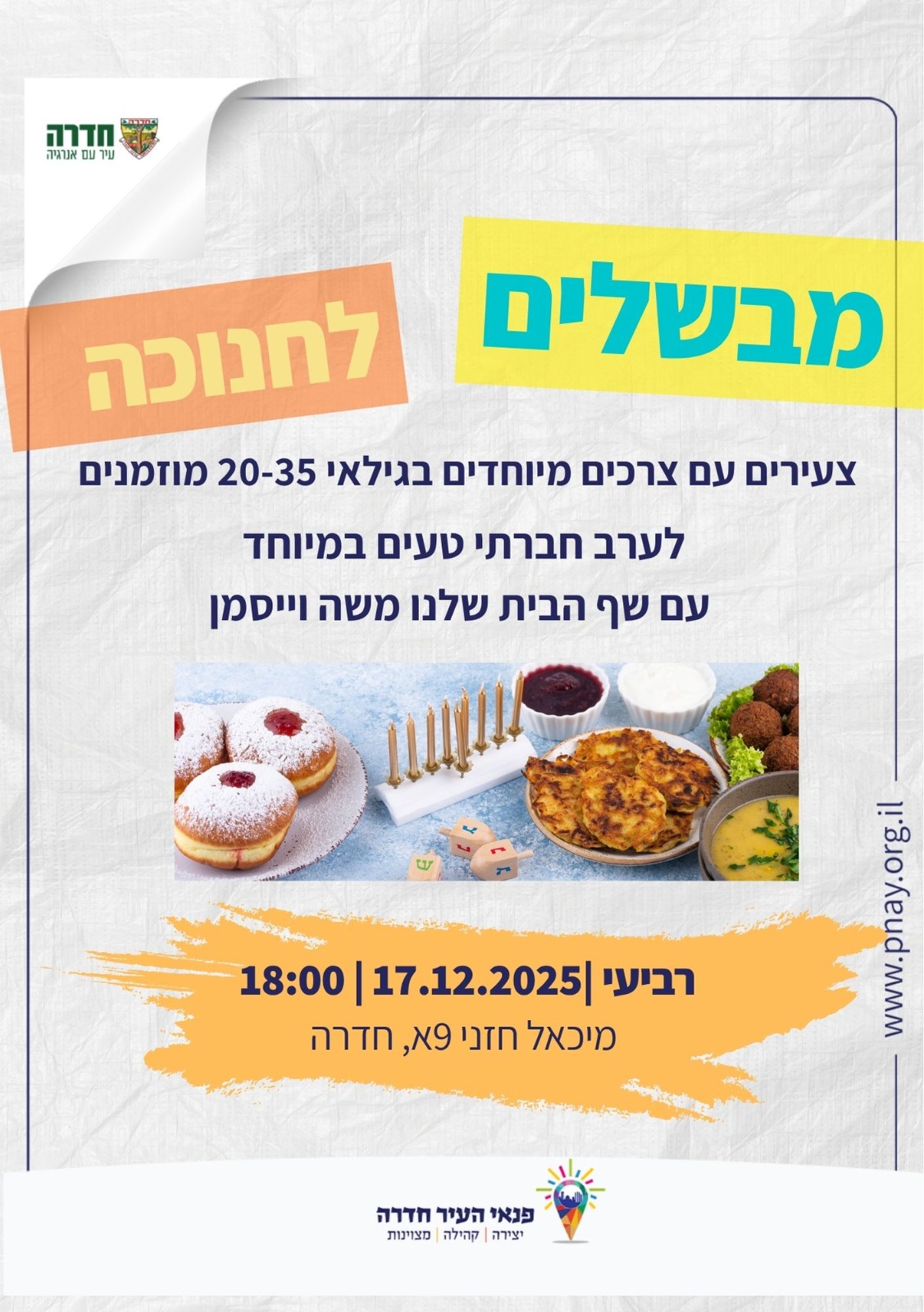 מפגש חברתי לחנוכה לצעירים בגילאי 18+. הדלקת נרות ובישולים טעימים לחג